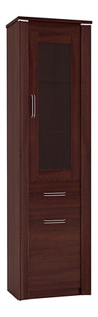 Vysoká vitrína s horními, částečně prosklenými dvířky a dvěma skleněnými poličkami. Pod nimi je zásuvka a ve spodní části opět dvířka. K proskleným poličkám si můžete přikoupit LED osvětlení. Vitrína je univerzální a tak si můžete namontovat dvířka s levým nebo pravým otevíráním.