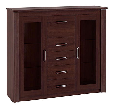 Nízká vitrína s výklopnými dvířky uprostřed, pod nimiž jsou čtyři zásuvky. Po stranách jsou částečně prosklená dvířka a za nimi prostor se dvěma skleněnými poličkami. Ty si můžete podsvítit přikoupením efektního LED osvětlení.