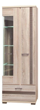 Moderní obývací sestava přichází ve dvou atraktivních barevných provedeních. Kombinuje dva barevné odstíny dřeva dub sonoma a to světlé - truflový a tmavé. Kromě hotových sestav si pomocí jednotlivých segmentů můžete vyskládat obývací pokoj podle Vašich potřeb a představ. Elegantní kontrastní pruhy doplňují idesignové úchyty dvířek. Prosklené části vitrín jsou podsvíceny LED osvětlením. To zvýrazní předměty umístěné v nich.