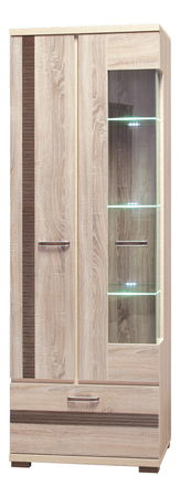 Moderní obývací sestava přichází ve dvou atraktivních barevných provedeních. Kombinuje dva barevné odstíny dřeva dub sonoma a to světlé - truflový a tmavé. Kromě hotových sestav si pomocí jednotlivých segmentů můžete vyskládat obývací pokoj podle Vašich potřeb a představ. Elegantní kontrastní pruhy doplňují idesignové úchyty dvířek. Prosklené části vitrín jsou podsvíceny LED osvětlením. To zvýrazní předměty umístěné v nich.