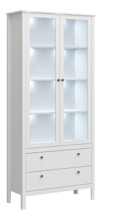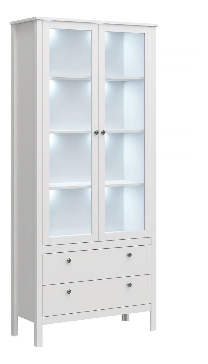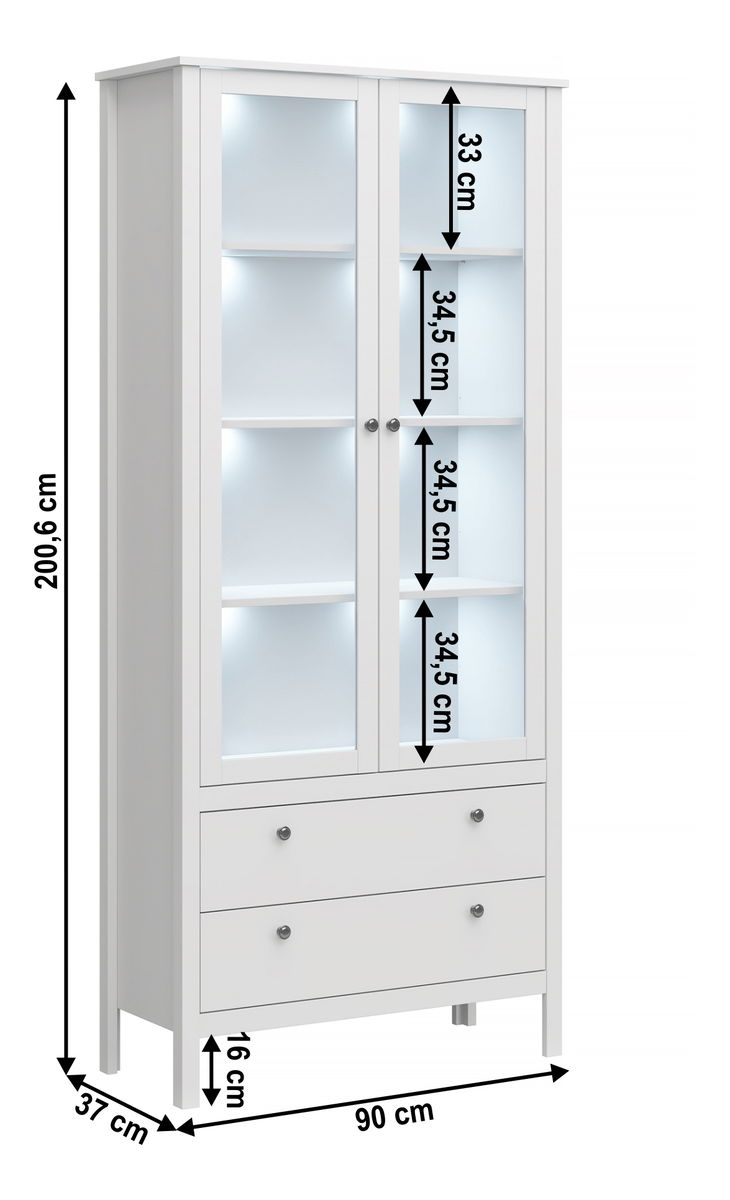 Vysoká vitrína Otis 2W2S (bílá) o výšce 200,6 cm, šířce 90 cm a hloubce 37 cm je ideálním řešením pro dostatek úložného prostoru. Vrcholová část vitríny nabízí tři poličky, kde můžete uspořádat své věci. Spodní část je vybavena dvěma šuplíky, které jsou perfektní pro ukládání důležitých dokumentů. Skleněná dvířka na vrchní části vitríny dodávají elegantní a luxusní vzhled.