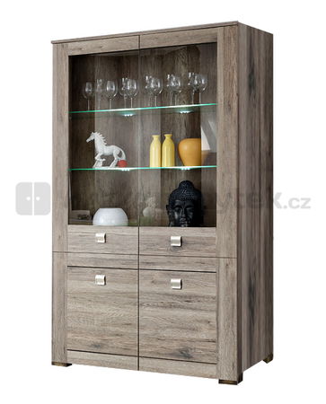 Dvoudílná vitrína má horní část prosklenou a obsahuje dvě skleněné poličky. Ve spodní části jsou dvoje dvířka a za nimi dva prostory s poličkou. Designové úchyty a barva dřeva san remo dodávají nábytku klasický charakter. Nábytek je postaven na decentních nožičkách.