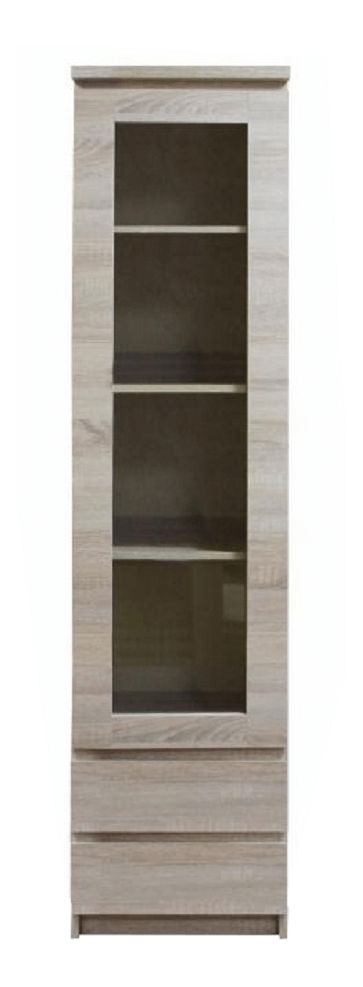 Vitrína Punkto Typ 04 1D2S o výšce 200 cm a hloubce 41 cm je dokonalým doplňkem do každého obývacího pokoje. Tato jednodveřová vitrína obsahuje plné police a dvě zásuvky, které jsou rovněž umístěny vedle sebe na spodní části vitríny. Vitrínu z řady Panama vám doporučujeme, pokud hledáte moderní sektorový nábytek, který navodí pocit luxusu v místnosti. Barevná kombinace dubu sonoma a moderní bezúchytové otevírání vitríny jsou skvělým provedením pro každý interiér. Materiál korpusu a polic je DTD laminován a každý díl je vybaven ABS hranami, což zaručuje dlouhou životnost nábytku. Rozměry vitríny jsou 50x41x200 cm, tloušťka materiálu korpusu je 16 mm a vrchní desky 25 mm. Vitrína se dodává v demontu.