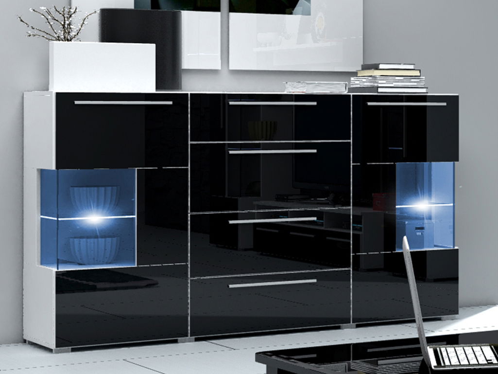 ZobrazitTřídílná vitrína s částečně prosklenými dvířky. Za nimi se nacházejí skleněné poličky, které jsou podsvíceny LED osvětlením. To zvýrazní předměty, které jsou na poličkách položeny. Uprostřed vitríny se nacházejí čtyři zásuvky. Fronty mají lesklou povrchovou úpravu. Podlouhlé úchyty jsou vyrobeny z PVC a ladně dotvářejí celkový design vitríny.