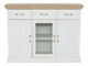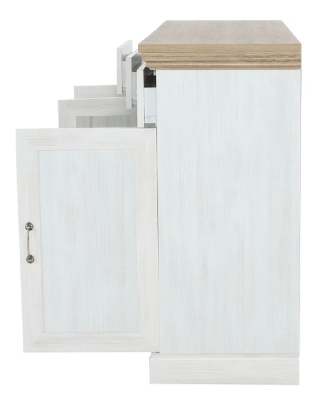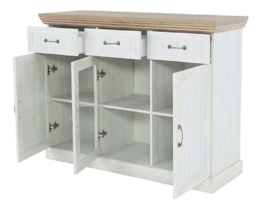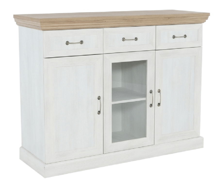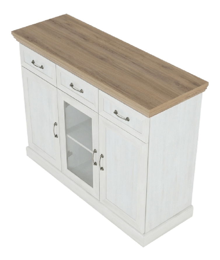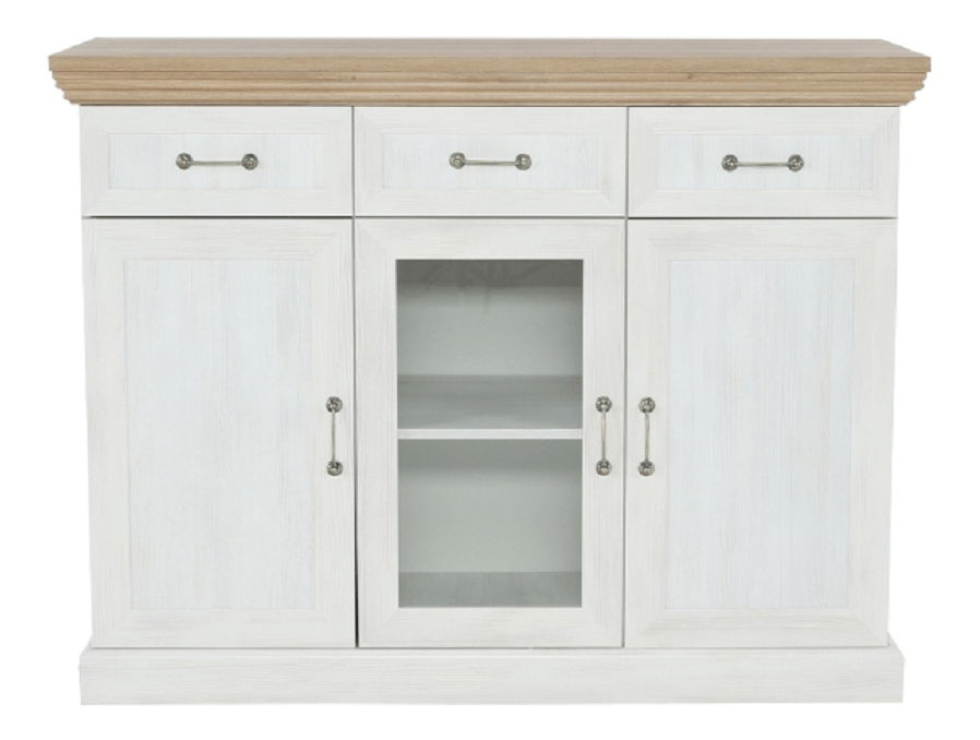 Elegantní a praktická komoda Royal v anglickém stylu, kterou si zařídíte obývácí pokoje, pracovny nebo jídelny. Má tři zásuvky a prosklenou část uprostřed. Barevné provedení je bílá sosna nordická v kombinaci s dubem divokým.
