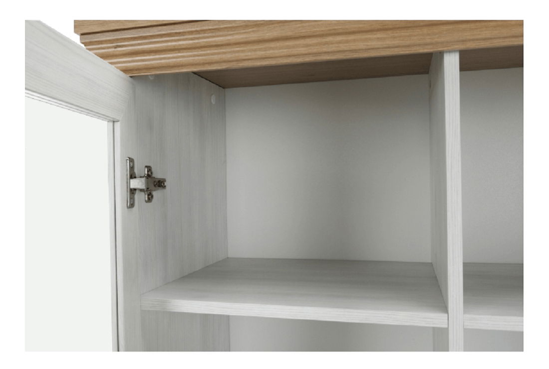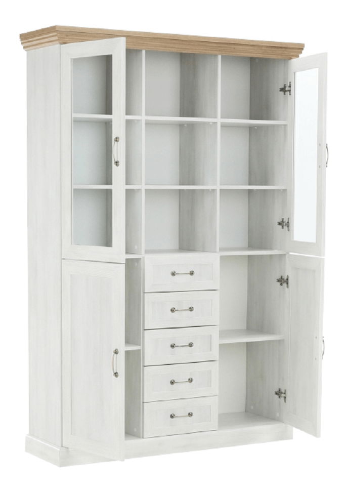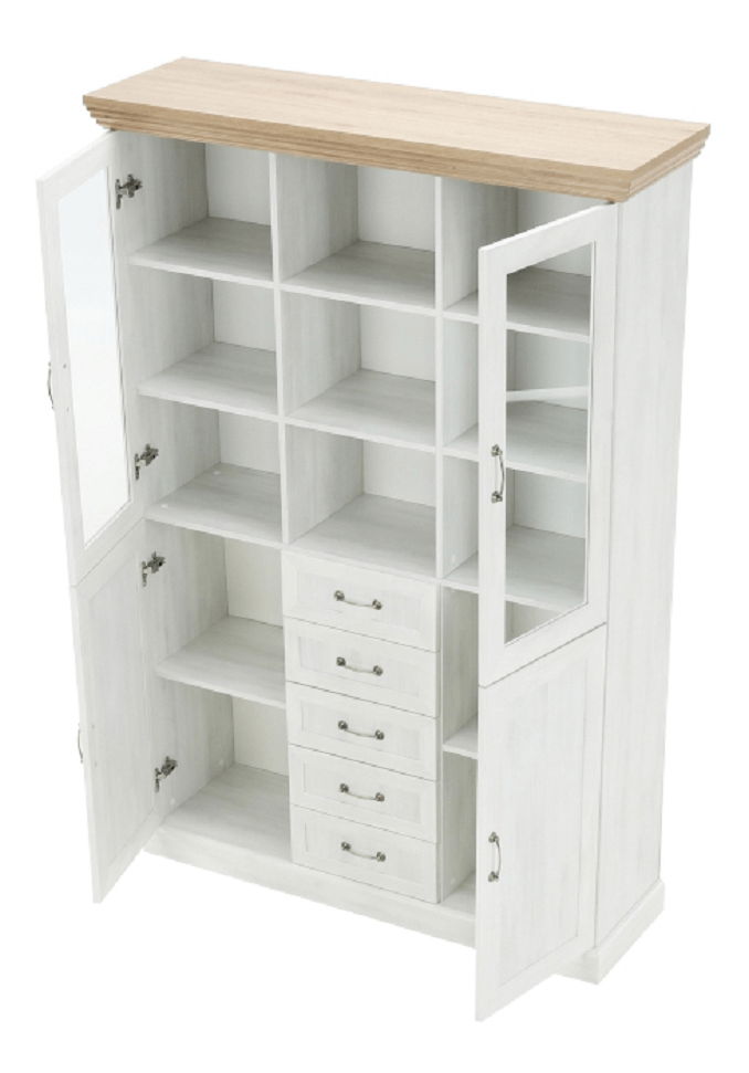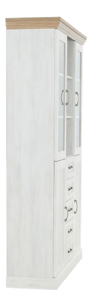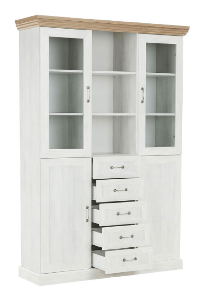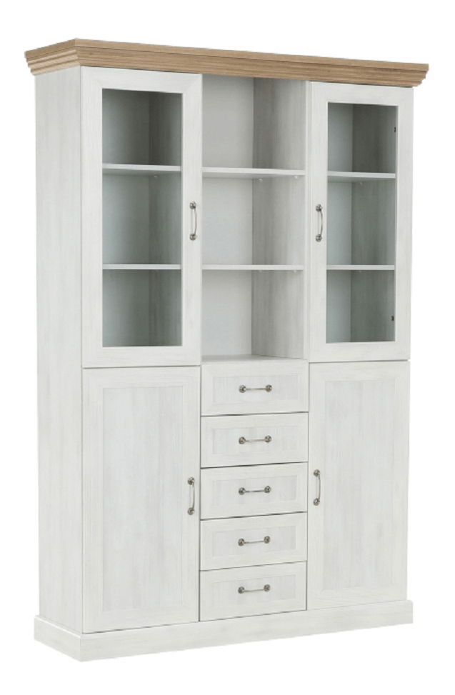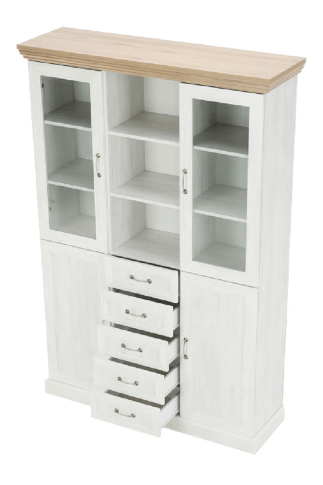 Prostorná vitrína Royal se dvěma prosklenými částmi a dvířky a prostřední částí s policemi a zásuvkami. Na vrchu má ozdobnou vyřezávanou lištu a dvířka a zásuvky mají kovové úchyty. Zkrášlete si jí jídelny, pracovny nebo obývací pokoje. Je v barevném provedení bílá sosna nordická v kombinaci s dubem divokým.