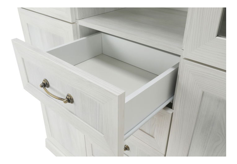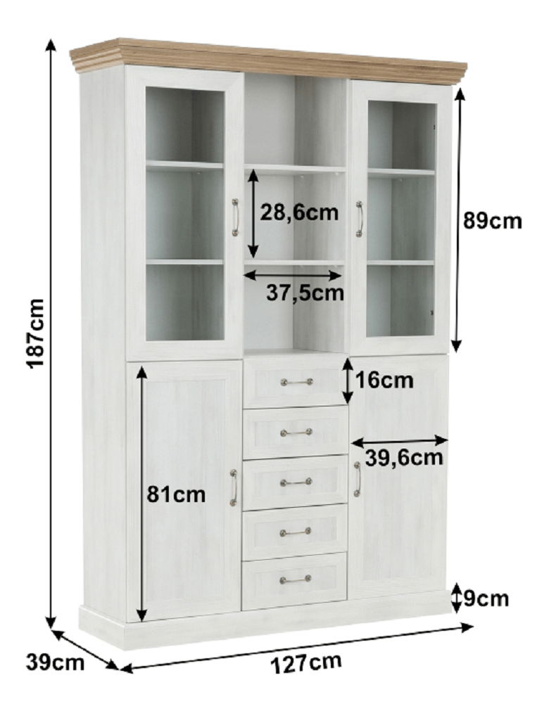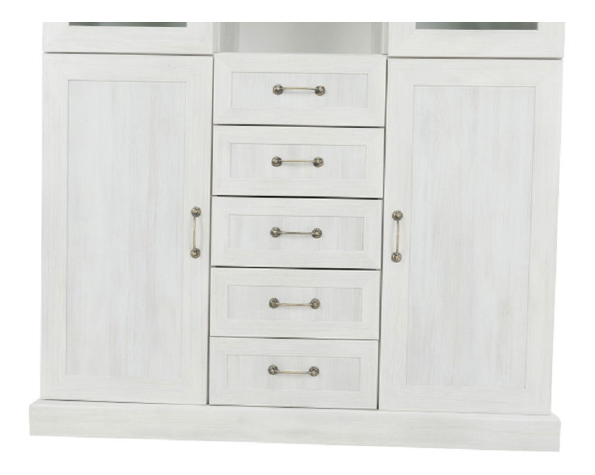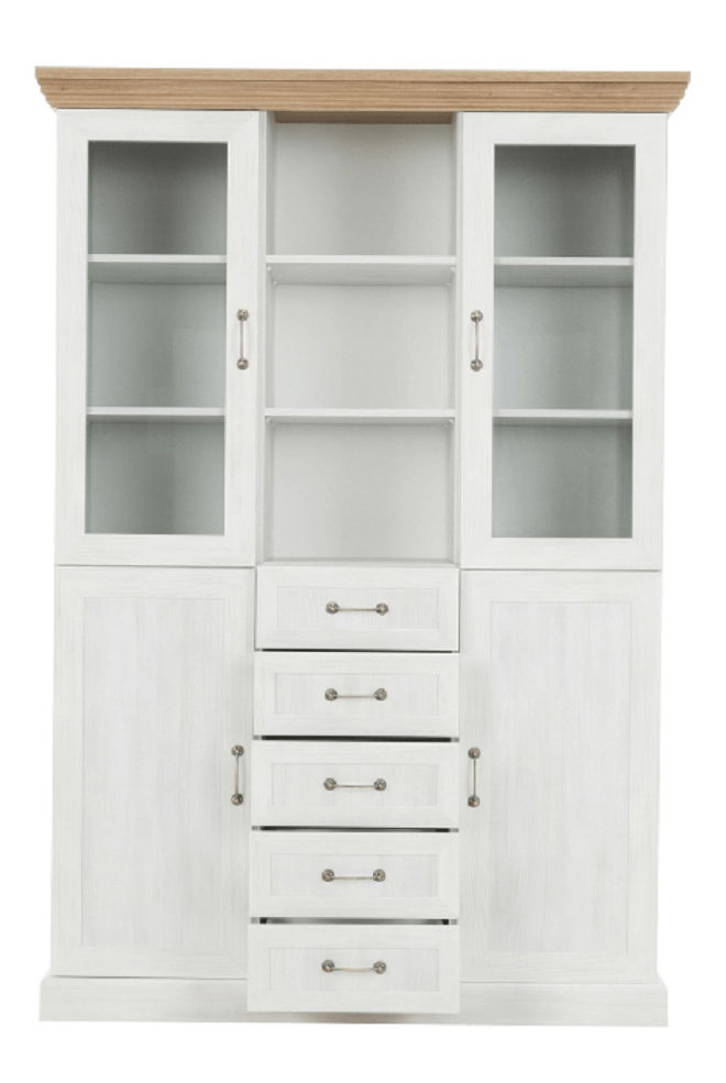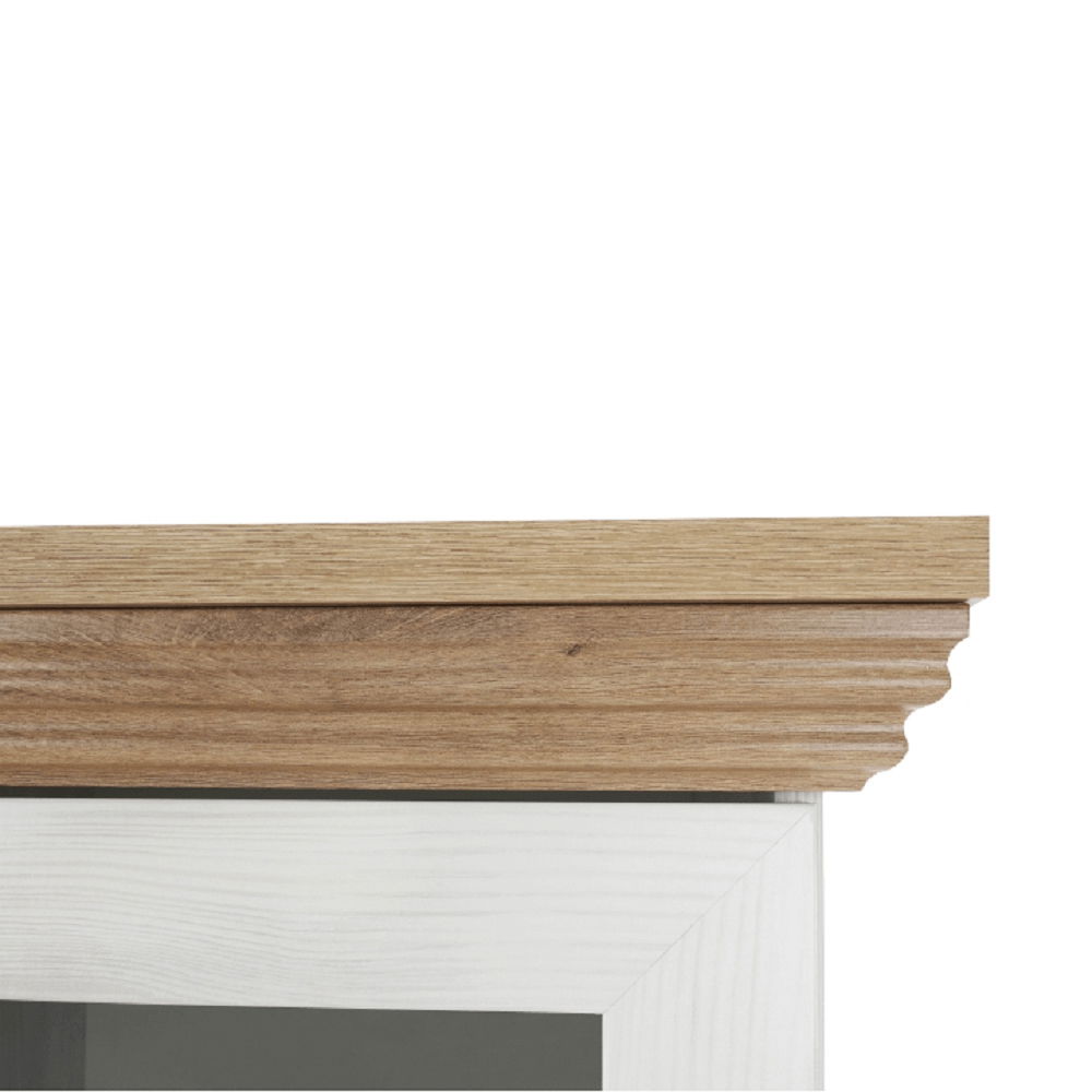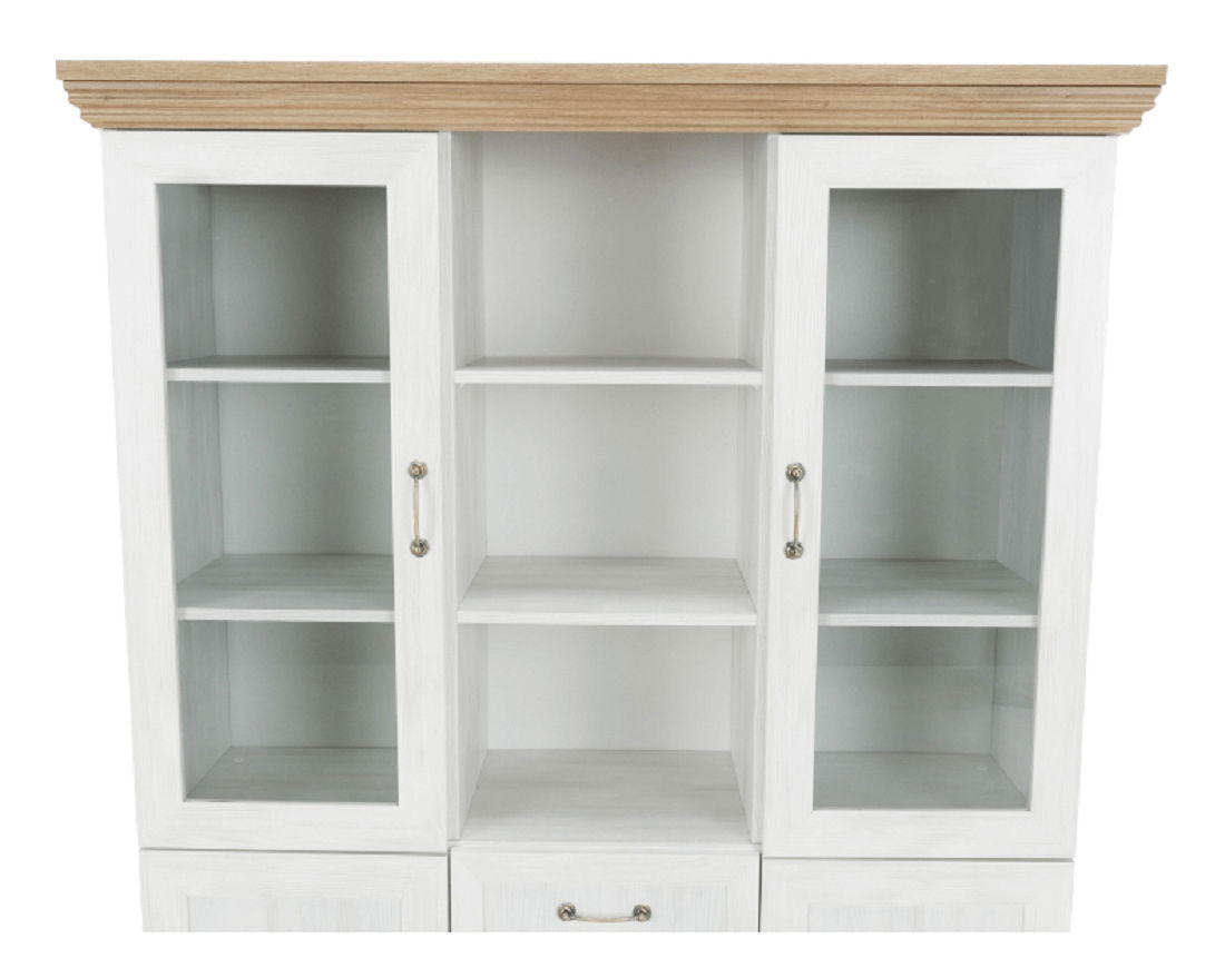 Prostorná vitrína Royal se dvěma prosklenými částmi a dvířky a prostřední částí s policemi a zásuvkami. Na vrchu má ozdobnou vyřezávanou lištu a dvířka a zásuvky mají kovové úchyty. Zkrášlete si jí jídelny, pracovny nebo obývací pokoje. Je v barevném provedení bílá sosna nordická v kombinaci s dubem divokým.