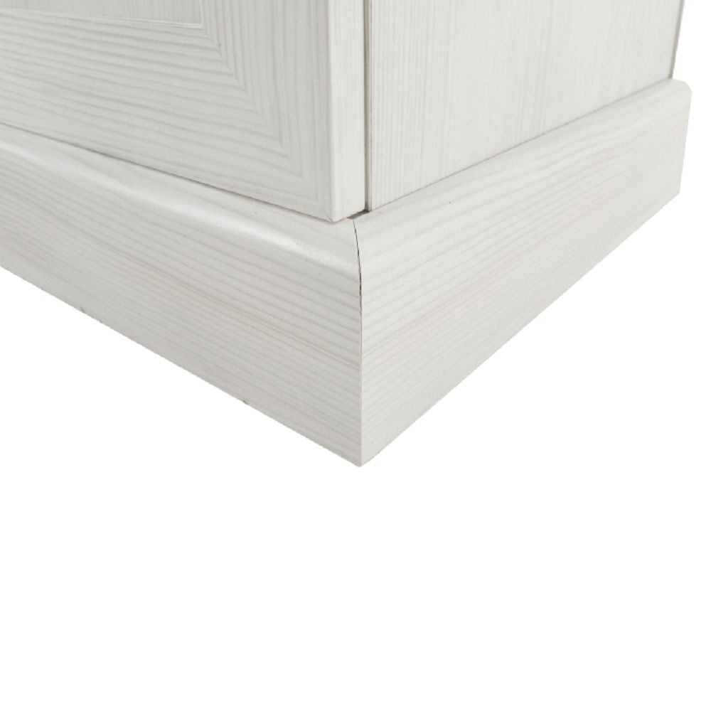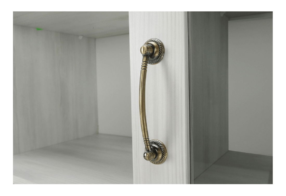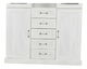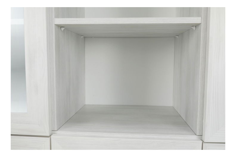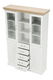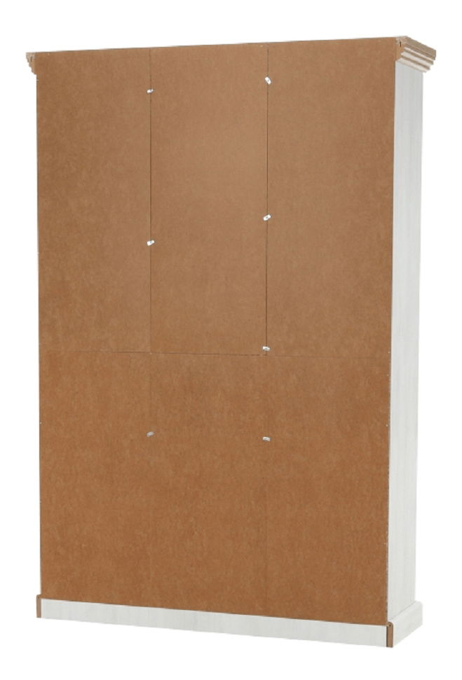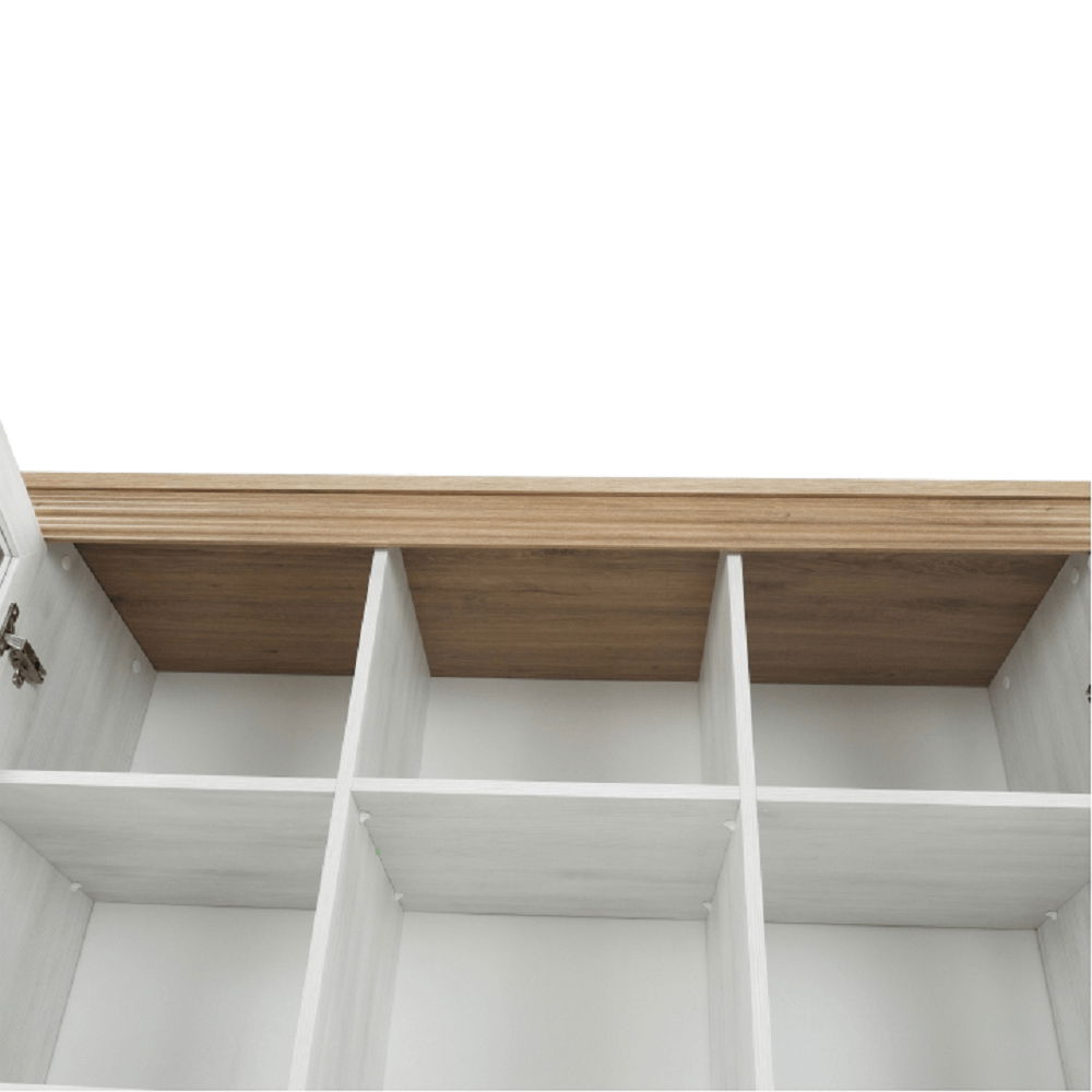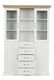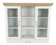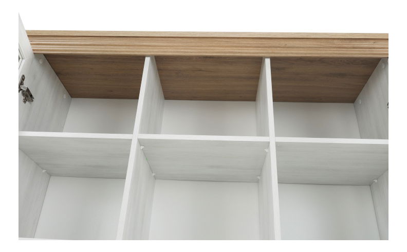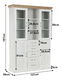 Prostorná vitrína Royal se dvěma prosklenými částmi a dvířky a prostřední částí s policemi a zásuvkami. Na vrchu má ozdobnou vyřezávanou lištu a dvířka a zásuvky mají kovové úchyty. Zkrášlete si jí jídelny, pracovny nebo obývací pokoje. Je v barevném provedení bílá sosna nordická v kombinaci s dubem divokým.