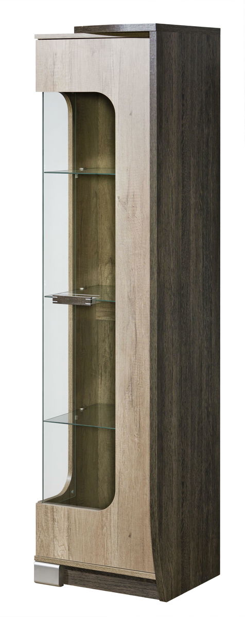 Vitrína Roverdon se skleněnými polička a zasklením ze dvou stran je ideální do obývacího pokoje nebo pracovny. Kromě dekorací či fotek je vhodná i odkládání porcelánu, sklenic apod. Vitrína je zajímavá i tím, že kombinuje 2 odstíny s motivem dřeva a sklo. Vzhledem k její konstrukci se dá umístit i do rohu, aniž byly zastíněny věci uvnitř. Dostupné je levé i pravé provedení.