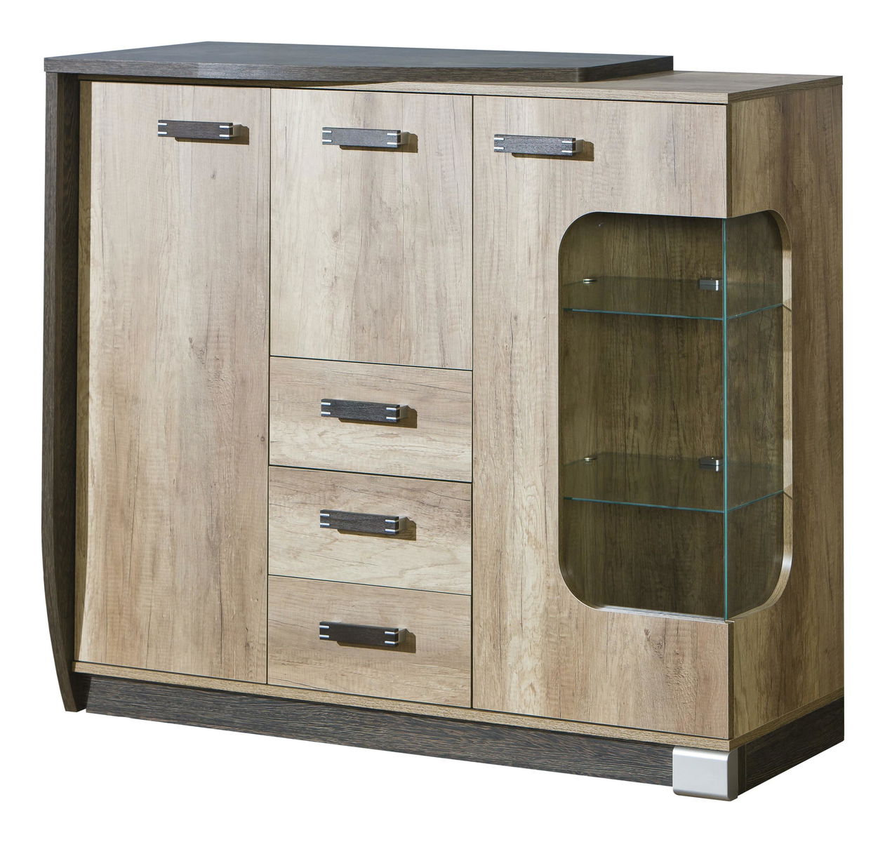 ZobrazitSkříňka s vitrínou Roverdon se skleněnými polička je ideální do obývacího pokoje nebo pracovny. Vitrína má dostatek úložných prostor v zásuvkách i ve skříňkách. Vitrína vyniká i tím, že kombinuje 2 odstíny s motivem dřeva a sklo. Vzhledem k její konstrukci se dá umístit i do rohu, aniž byly zastíněny věci uvnitř. Dostupné je levé i pravé provedení.