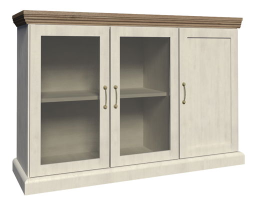 Nízká vitrína se dvěma prosklenými dveřmi uprostřed a nalevo a jedněmi plnými dveřmi umístěnými na pravo pod horní masivní deskou
