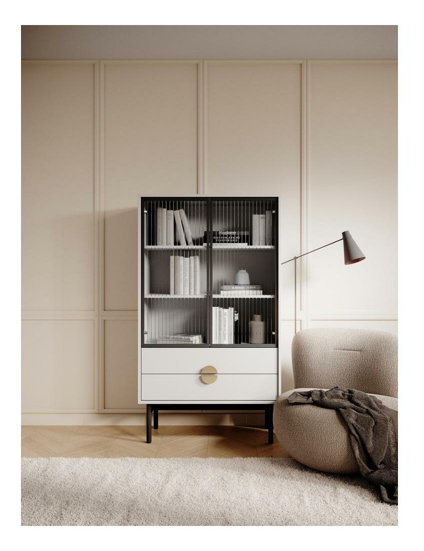 ZobrazitChcete udělat metamorfózu ve svém interiéru? Máte rádi originální řešení a jednoduché formy nábytku? Výběrem naší kolekce vnesete do interiéru harmonii a eleganci a potěšíte své hosty. Vitrína s jedinečným designem v elegantní bílé barvě dokonale zapadne do moderních interiérů. Je vyroben z kvalitní laminované dřevotřískové desky, která zajišťuje dlouhodobé a bezproblémové používání. Jeho charakter obohacuje pevný rám z černé oceli, který činí nábytek nejen odolným, ale dodává mu i industriální šarm. Zlaté úchytky tvořící kruh jsou zase nejen praktickým prvkem, který usnadňuje otevírání, ale dodávají celé skříňce eleganci a jemný lesk. Tento malý, ale rafinovaný detail odlišuje nábytek a dodává mu mírně luxusní akcent. Vitrína byla navržena s ohledem na funkčnost, proto má zásuvky na menší předměty a uzavřenou část s policemi na dekorace, rodinné suvenýry nebo mini knihovnu. Další výhodou je prosklená přední strana z drážkovaného, dekorativního skla, které dodává celku lehkost a eleganci. Kombinace nevšední barvy s černým rámem a zlatými úchyty vytváří harmonický a moderní celek, který dokonale zapadne do různých interiérových aranžmá a dodá jim jedinečný charakter. Tento kus nábytku je nejen praktickým úložným řešením, ale také designovým prvkem, který ozdobí a zdůrazní individuální styl každé místnosti Detaily produktu: korpus a čela z laminované desky White Body 0110 SM, odolné vůči vlhkosti, vysoké teplotě. a škrábanců, rám vyrobený z černé prášek lakované oceli, což usnadňuje udržování pořádku pod nábytkem, zásuvky se otevírají metodou 'push to open', rozměry police: výška 28,5 cm x hloubka 37 cm, zlatá barva rukojeti z broušené oceli.