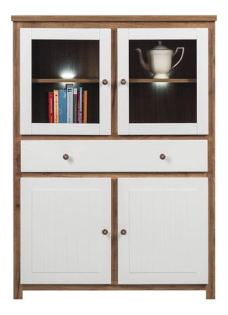 Zajímavý styl a dominance této vitríny jsou nepřehlédnutelné. Z dvěma prosklenými dvířky (čiré sklo) se nacházejí poličky. Na spodku vitríny jsou umístěny 2 skříňky s dvířky. Uprostřed vitríny je umístěna rozměrná zásuvka. Zajímavé drobné kulaté úchyty na dvířkách v provedení dub příjemně osvěží světlé provedení. K vitríně lze dokoupit doplňkové LED osvětlení (2 LED), které naleznete níže na této stránce v sekci doporučujeme dokoupit.
