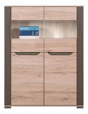 Krásná dvoudílná vitrína (použité čiré sklo) v provedení dub Sanremo v kombinaci s odstínem latte dokonale doplní stylově zařízenou obývací místnost, jídelnu nebo jinou pokoj. Zajímavé vykrojené úchyty a nízké nožky. K vitríně lze dokoupit doplňkové LED osvětlení (1 LED), které naleznete níže na této stránce v sekci doporučujeme dokoupit.