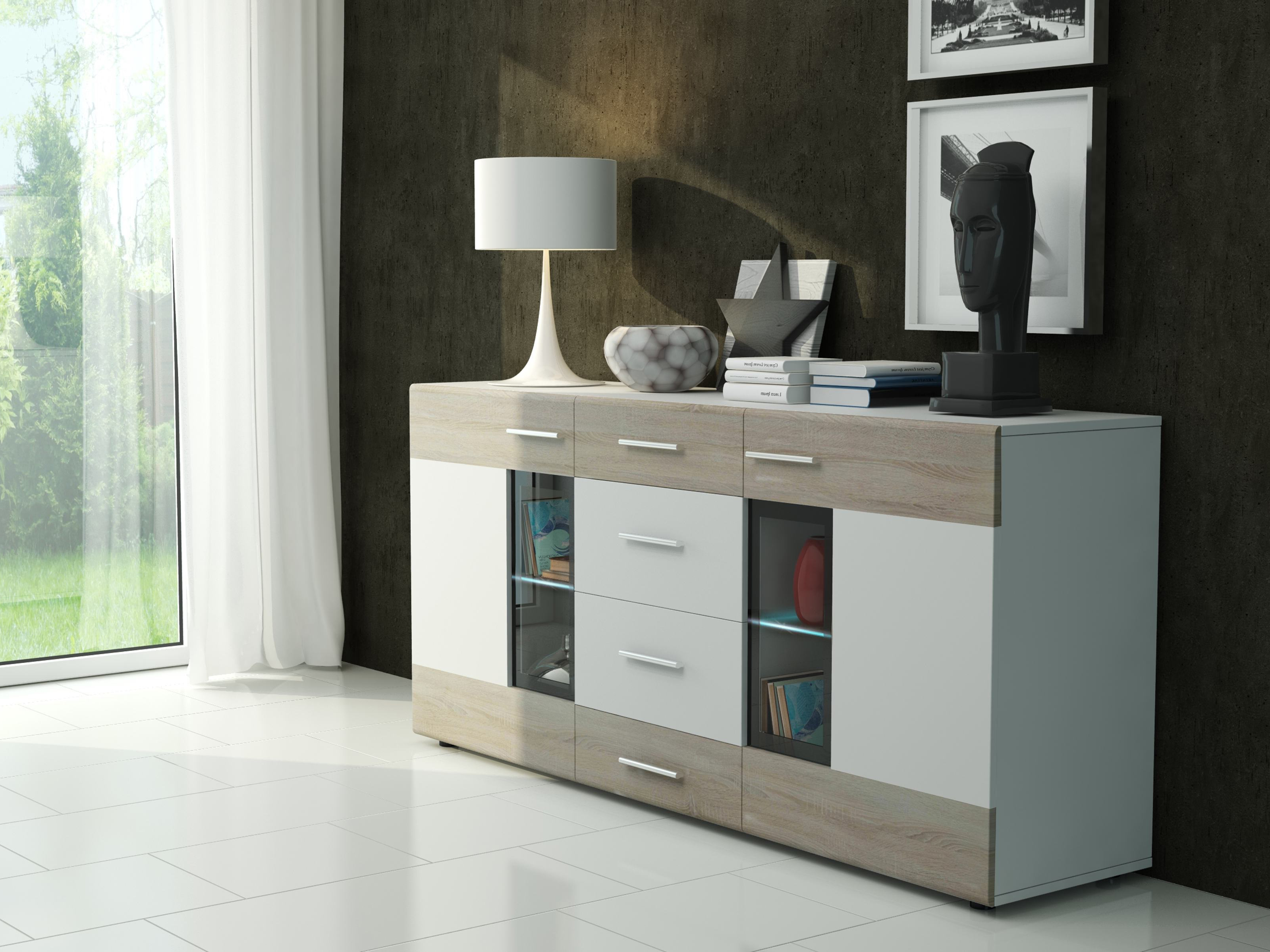 Prostorná vitrína moderního stylu je praktickým doplňkem k obývací stěně. Nabízí množství úložného prostoru. Je třídílná, přičemž uprostřed se nacházejí 4 zásuvky a po stranách skříňky s částečně prosklenými dvířky. V každé skříňce se nachází jedna skleněná polička. Moderním a velmi efektním doplňkem v dnešní době je LED osvětlení. To si můžete přiobjednat i Vy. Krásně to prosvětlí vnitřek vitríny a zvýrazní předměty umístěné v ní.