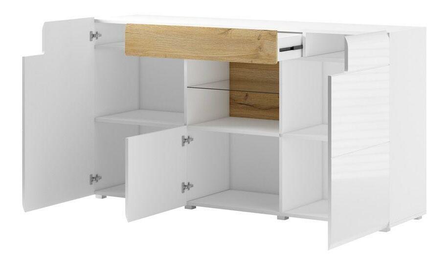 Vitrína s velkým úložnými prostory v podobě zásuvek i dvířek. V prostřední části skleněná police na vystavení předmětů. Nabízíme k dokoupení LED osvětlení. Výjimečný kus nábytku ze série Tamie dodá eleganci a vkus každého obývacího pokoje či kanceláře.