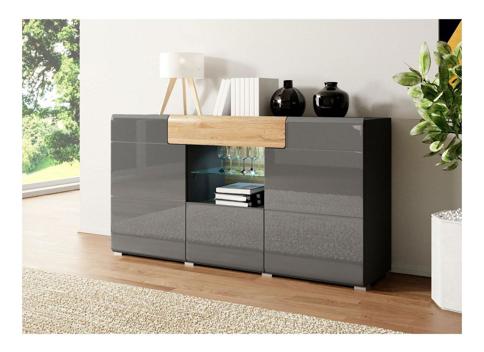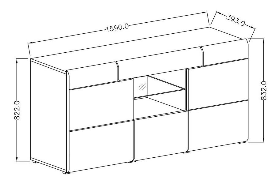 Vitrína s velkým úložnými prostory v podobě zásuvek i dvířek. V prostřední části skleněná police na vystavení předmětů. Výjimečný kus nábytku ze série Tamie dodá eleganci a vkus každého obývacího pokoje či kanceláře. Nabízíme k dokoupení LED osvětlení.