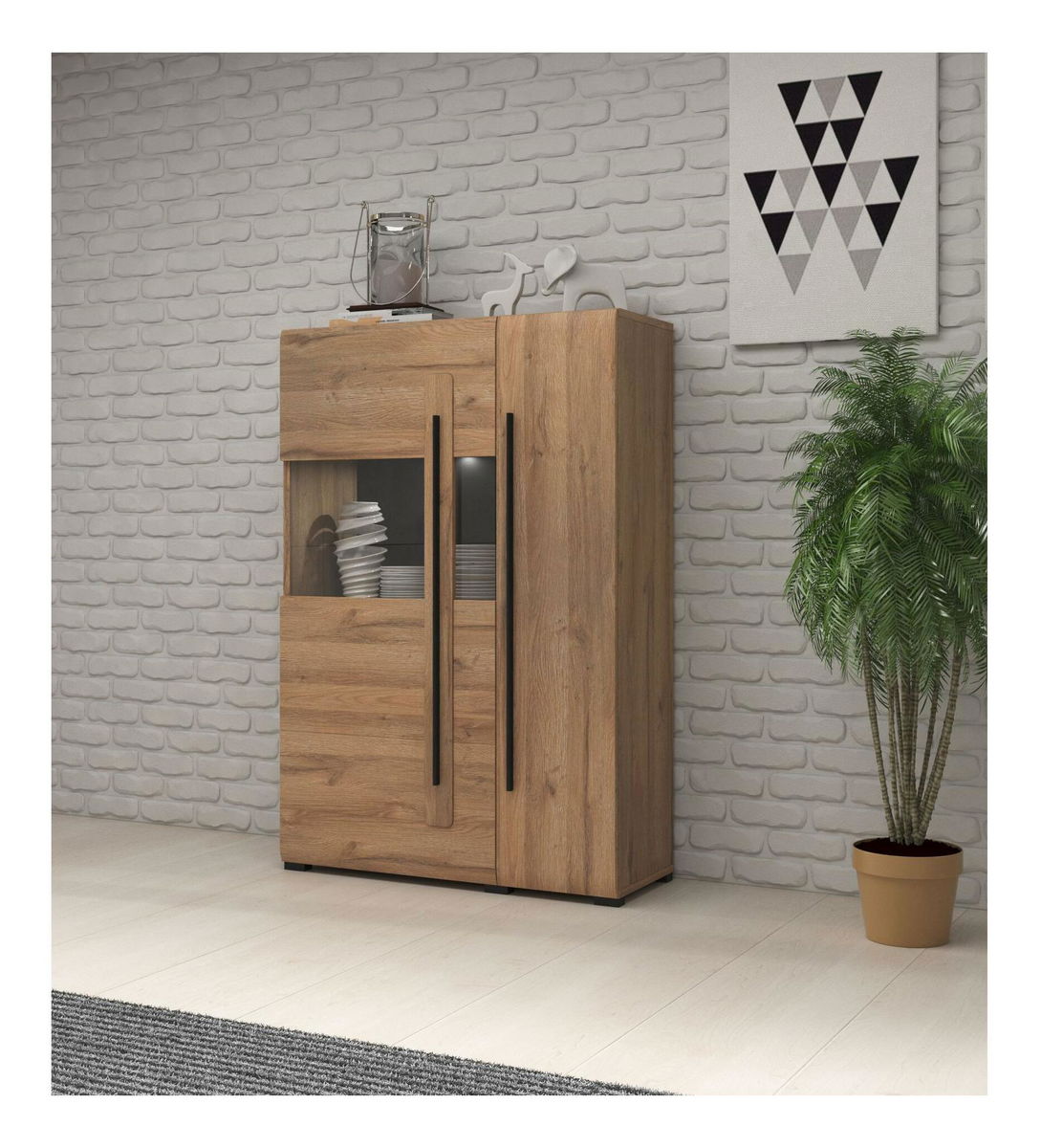 Moderní dvoudvéřová vitrína ze série Tashia. Část dveří prosklená pro expozici předmětů. Úložný prostor v podobě polic. Přesné linie nábytku dodají eleganci do každého obývacího pokoje či kanceláře. Nabízíme k dokoupení LED osvětlení.