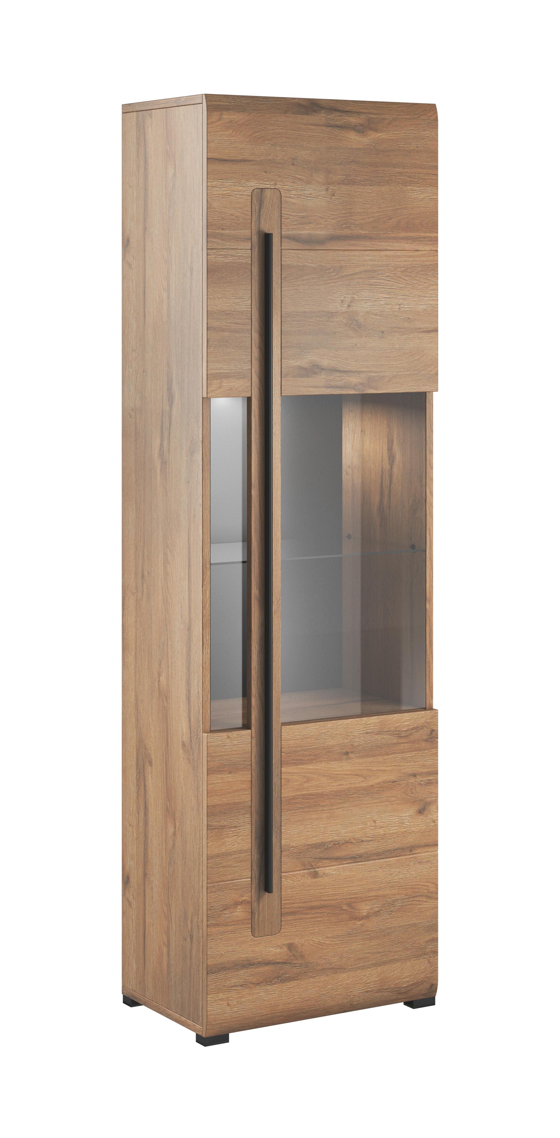 Vitrína Tipton Typ 05 (P) výška 204 cm hloubka 39 cm Dub Grandson je kus nábytku, který okamžitě přiláká vaši pozornost. Výrazný design s oblými horními a dolními dveřmi, které mají jemné vyřezané linie, je opravdu působivý. Ve středu vitríny se nachází skleněný prostor se skleněnou poličkou. Tento prostor může sloužit k vystavení vašich nejkrásnějších předmětů nebo křehkých ozdob. Vitrína může být doplněna o moderní LED osvětlení, které vytváří příjemnou atmosféru a dodává obývacímu pokoji nový šmrnc. S touto vitrínou budete mít k dispozici nejen funkční kus nábytku, ale také estetický prvek, na který budete hrdí.
