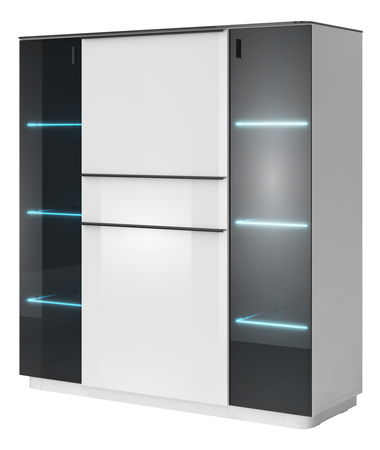 Prostorná vitrína Toft je tvořena třemi částmi - boční dvířka jsou prosklené a poličky osvětlenou LED světlem, střední část má bílé lesklé plná dvířka, které tvoří kontrast ke černému sklu. Vrchní skříňka se otevírá shora dolů a spodní skříňka se otevírá klasicky z boku a má jednu polici. Mezi skříňkami je i jedna zásuvka. Laminované desky, ze kterých je vitrína vyrobena jsou odolné vůči poškrábání i slunečnímu záření. Sklo je tvrzené.