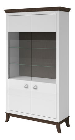 Tato dvoudveřová vysoká vitrína je ideálním doplňkem pro vystavení vašich dekorací a cenností s nádechem elegance. Vyrobená z odolné laminované dřevotřísky s ABS hranami, vitrína zajišťuje trvanlivost a estetický vzhled. Stabilitu jí dodávají nožičky z masivu, které přinášejí do přírodního prostoru. Vitrína je vybavena dvěma dveřmi se systémem tichého zavírání, což umožňuje pohodlné a nerušené používání. Vnitřní úložné prostory zahrnují dvě skleněné a tři dřevěné police, které poskytují flexibilní možnosti uspořádání. Za příplatek je možné osvětlení, které ještě více zvýrazní vystavené předměty a vytvoříte příjemnou atmosféru.