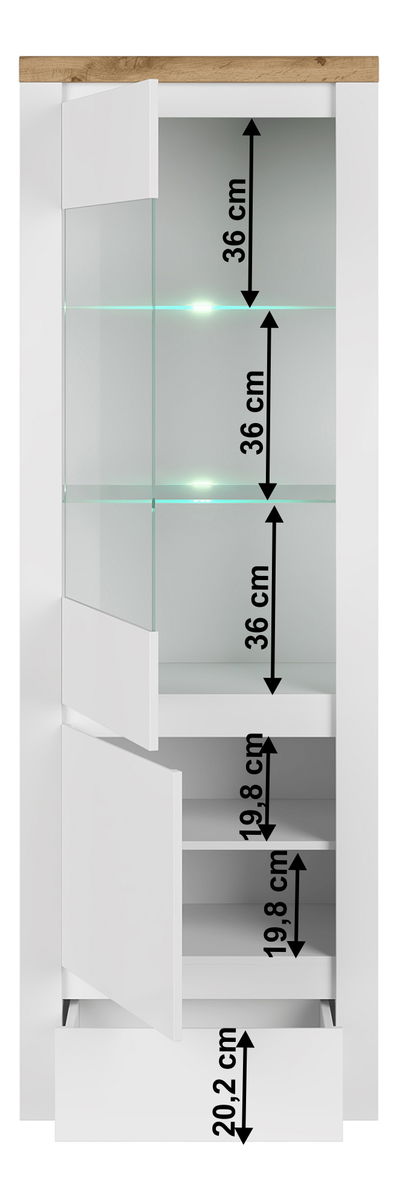 Vitrína Vilgi 1D1W1S je ideální pro zařízení obývacích a jídelních místností, kde se jistě vynikne svým elegantním designem a jednoduchostí. Kombinace lesklého bílého a dubu wotan dodává vitríně šarm a jistě se stane vaším oblíbeným kouskem. Vitrína má jednu dveřní skříňku s dvířky se skleněnou výplní a dvěma skleněnými poličkami. Dolní část má také dveře, ale bez skleněné výplně a jednu poličku. Na spodku vitríny je šuplík, který poskytuje dostatek místa pro důležité dokumenty. I když je součástí sektorového nábytku Vilgi, díky svému designu se vitrína snadno kombinuje s jakýmkoli moderním vybavením vašeho domova.