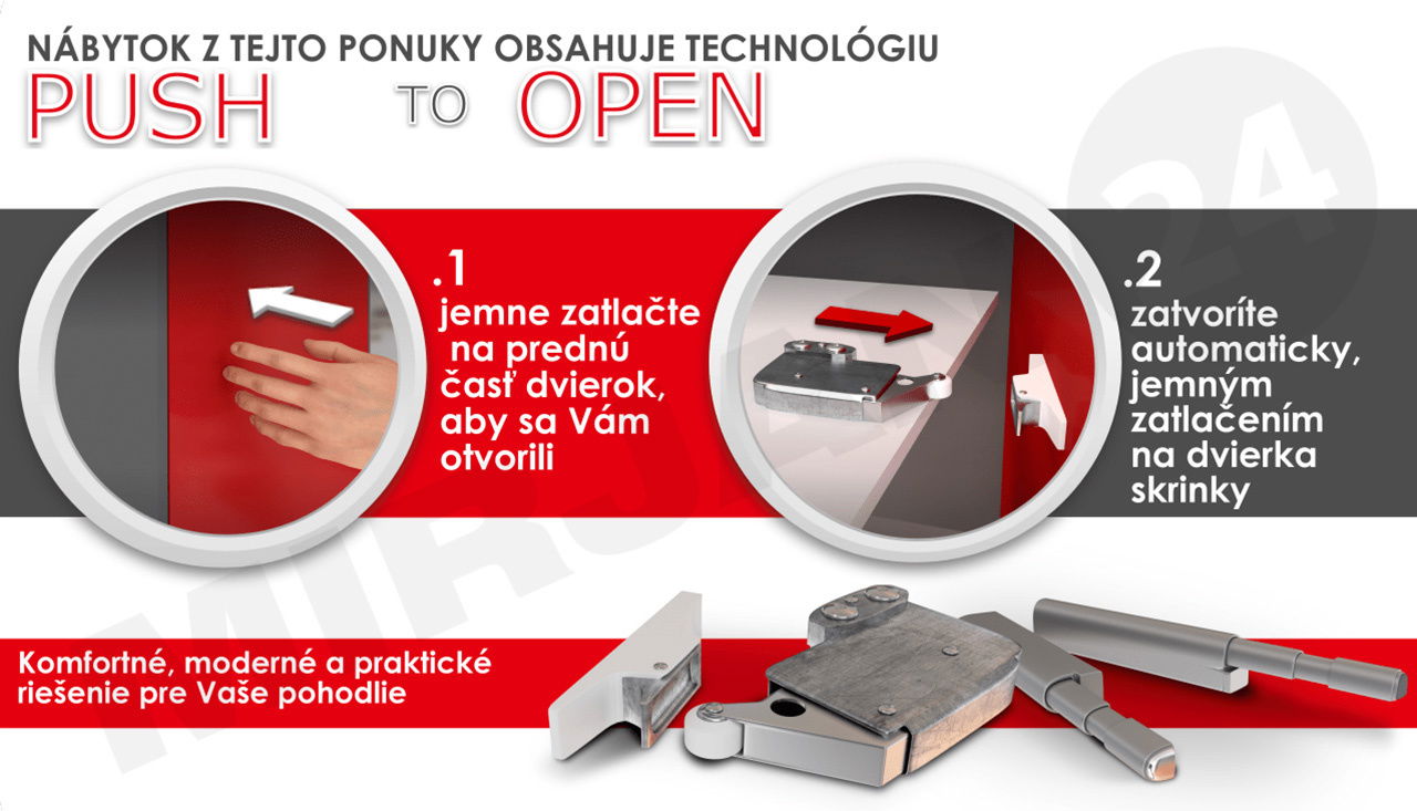 dvířka – deska MDF ve vysokém lesku, systém otevírání "PUSH TO OPEN",