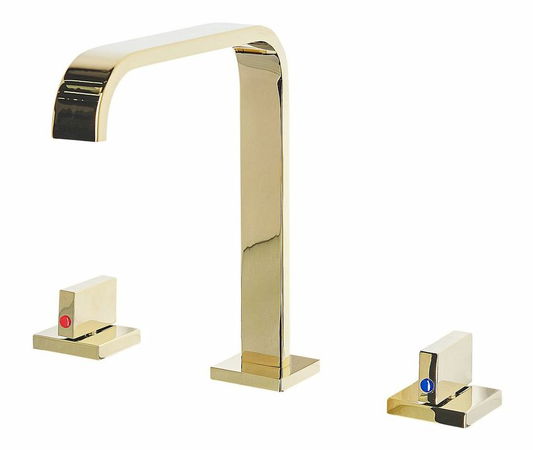 Tato baterie se dvěma kohoutky se stane elegantním doplňkem každé koupelny. Je vyrobena z odolné mosazi v lesklé zlaté barvě a lze ji používat s různými systémy ohřevu vody. Samostatné páčky umožňují přesnější nastavení proudu a teploty vody. Díky minimalistickému zaoblenému designu se tento kousek hodí do koupelen v různých stylech.