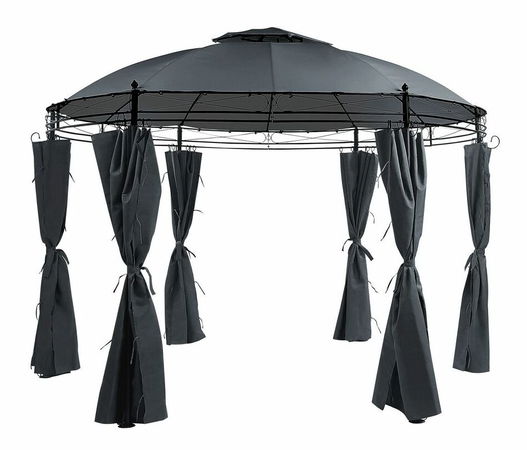 Tento tmavě šedý altán, který je ideální pro relaxaci a lenošení v zahradě, vám pomůže užít si slunečné dny strávené venku. Pevná ocelová konstrukce altánu je zárukou odolnosti a stability. Součástí jsou béžové závěsy, které lze zatáhnout vždy, když chcete více soukromí. Otvor v horní části zajišťuje cirkulaci vzduchu i tehdy, jsou-li závěsy zataženy.
