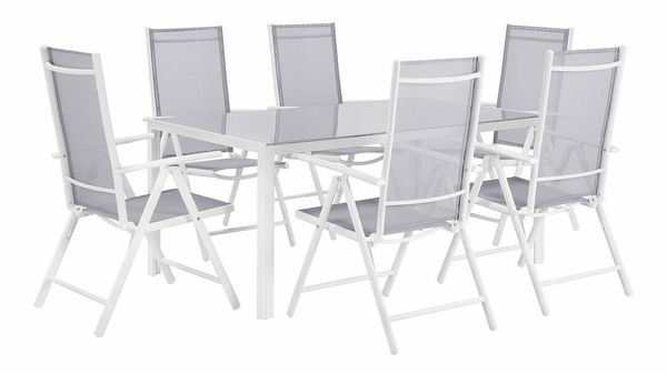 Tato praktická venkovní jídelní souprava, sestávající z jídelního stolu a soupravy šesti židlí, je nezbytným doplňkem každé moderní zahrady nebo terasy. Pevné hliníkové rámy s práškovým lakováním jsou výjimečně odolné a vydrží každodenní používání. Stolová deska z tvrzeného skla má sofistikovaný vzhled a jemně zvýrazňuje rám stolu. Textilní tkanina židlí je pružná a příjemná na dotek, zatímco hluboká sedadla s vysokými opěradly a područkami jsou zárukou pohodlného sezení. Tato zahradní souprava odolná vůči různým povětrnostním vlivům je výjimečným kouskem, který vám bude sloužit dlouhá léta.