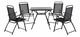 Tato jídelní souprava se skládá ze čtyř skládacích a lehkých židlí. Jsou vyrobeny z černé oceli s práškovým lakováním a kvalitního textilního materiálu, který je použit na opěradle a sedáku. Hrubá vrchní stolová deska je vybavena tvrzeným sklem. Celá souprava se dá jednoduše přemístit a skvěle vynikne na jakémkoli balkoně, terase či v zahradě u bazénu.