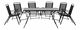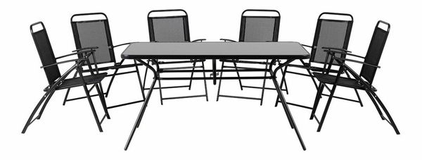 Tato jídelní souprava se skládá ze šesti skládacích a lehkých židlí. Jsou vyrobeny z černé oceli s práškovým lakováním a kvalitního textilního materiálu, který je použit na opěradle a sedáku. Hrubá vrchní stolová deska je vybavena tvrzeným sklem. Celá souprava se dá jednoduše přemístit a skvěle vynikne na jakémkoli balkoně, terase či v zahradě u bazénu.