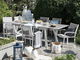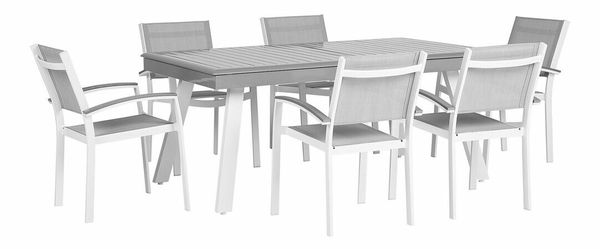 Vychutnejte si posezení s přáteli díky této praktické zahradní soupravě, která se skládá ze stolu s šesti židlí. Souprava je vyrobena z odolného hliníku, je odolná vůči UV záření, takže při vystavení slunečním paprskům neztratí barvu. Roztahovací stolová deska s lamelovým designem, která je vhodná ke stolování až pro deset osob, stojí na bílých nohách, které poskytují výbornou stabilitu. Židle s látkovým sedákem a opěradlem v šedé barvě poskytují pohodlné místo k sezení a zkrášlí jakýkoli moderní venkovní prostor.