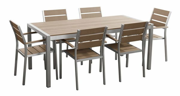 Elegantní a stylová venkovní jídelní souprava je skvělým doplňkem pro vaši zahradu nebo terasu. Souprava se skládá z jídelního stolu a židlí vyrobených z pevného rámu z leštěného hliníku a syntetického dřeva, což zaručuje snadnou údržbu a odolnost vůči povětrnostním vlivům. Židle jsou dodávány s loketními opěrkami, takže poskytují nejvyšší úroveň pohodlí. Navíc jsou stohovatelné, díky čemuž je lze snadno uskladnit. Díky minimalistickému designu je tato souprava univerzální a hodí se do každého moderního venkovního prostoru.