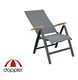 Elegantní vzhled a luxusní provedení tohoto polohovatelného křesla je to co můžete od něj očekávat. Má elegantně tvarovaný sedák a nastavitelnou opěrku zad s pojezdem v kolejnici. Konstrukce je celohliníková s kovovým kloubem, područky jsou v barvě teaku a barva výplně je antracit. Jeho skladnost, vysoká odolnost vůči povětrnostním vlivům a dlouhá životnost jsou vlastnosti které zaujmi nejednoho majitele zahrady, terasy nebo profesionálního zařízení.