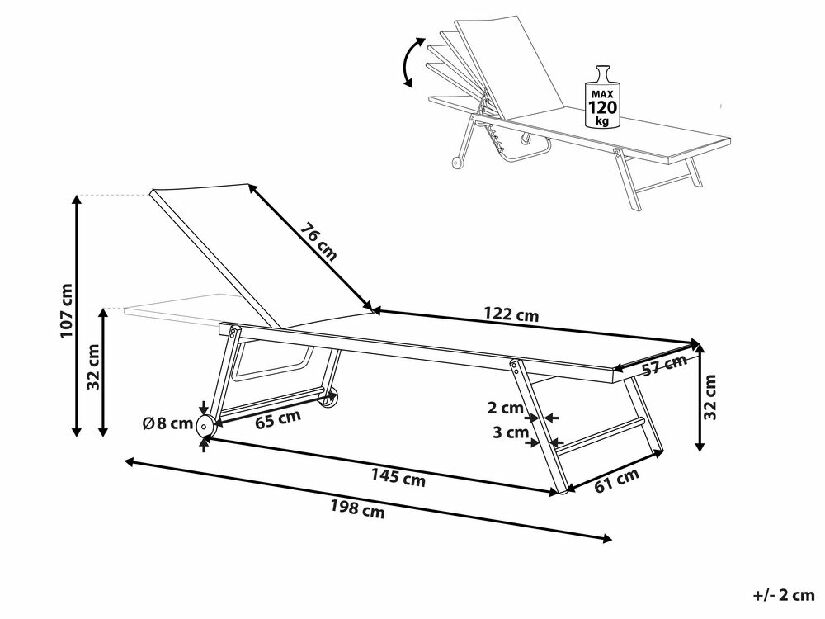 Užijte si horké slunečné dny ve vaší zahradě nebo na terase na tomto praktickém lehátku. Díky nastavitelnému opěradlu si jeho výšku můžete přizpůsobit vlastním potřebám, abyste mohli pohodlně sedět a relaxovat při čtení zajímavé knihy nebo jen tak ležet a opalovat se. Konstrukce je vyrobena z kvalitního a lehkého hliníku se zabudovanými kolečky, díky čemuž se velmi snadno přemisťuje z místa na místo. Syntetický materiál na sedáku a opěradle je velmi odolný a vyžaduje minimální péči a zároveň zdůrazňuje moderní vzhled tohoto lehátka.