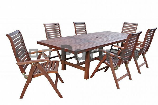 Krásná dřevěná zahradní sestava Auckland vyrobena z exotického dřeva meranti. Sestava obsahuje šest pohodlných polohovatelných křesel a obdélníkový rozkládací stůl. Rozkládací mechanismus se nachází ve středové části stolu. Stůl se dá nastavit na dvě možné délky. Křesla mají pět poloh a zaručí vám pohodlí.