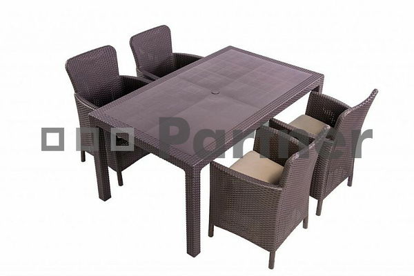 Moderní ratanová zahradní sestava Crazy v pěkném hnědém provedení. Je vyrobena z odolného umělého ratanu. Vynikne v zahradách, na prostorných terasách a verandách. Stůl má zároveň otvor na slunečník v průměru 5 cm. V sestavě se nachází stůl a čtyři křesla.