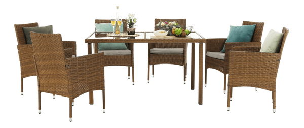 Zahradní nábytek Giselle 1+6 (umělý ratan) vám nabízí dokonalé řešení pro pohodlné a elegantní posezení na vaší terase nebo v zahradě. Tato zahradní sestava obsahuje jeden jídelní stůl s tvrzeným sklem (5mm tlustým) a šest křesel s polštáři, které vám zajistí maximální komfort. Barevné provedení je medová a krémová, což dodá vaší terase nebo zahradě příjemnou atmosféru. Rozměry stolu jsou 74 x 130 x 90 cm a rozměry každého křesla jsou 85 x 58 x 60 cm. Materiály, které byly použity při výrobě jsou umělý ratan, ocel, látka a tvrzené sklo. Oděruvzdornost textilie byla testována podle Martindale testu a dosáhla vysokých 95 000 odírek. Zahradní nábytek Giselle 1+6 (umělý ratan) je dodáván v demontu. Vychutnejte si letní dny v pohodlí a stylu s touto zahradní sestavou.