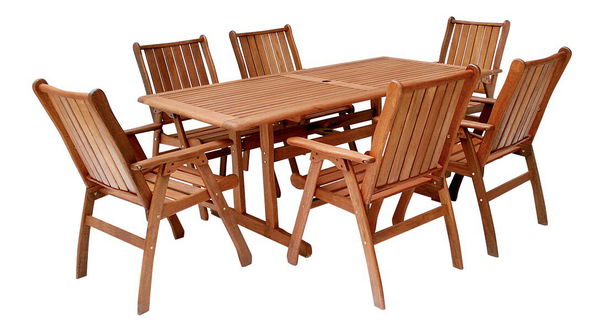Luxusní velká sestava zahradního nábytku. Set šesti židlí a jednoho stolu z tvrzeného dřeva Meranti. Vhodné pro zahradní kryté plochy a exteriéry. Při vhodném ošetření teakovým olejem lze používat i v exteriéru.