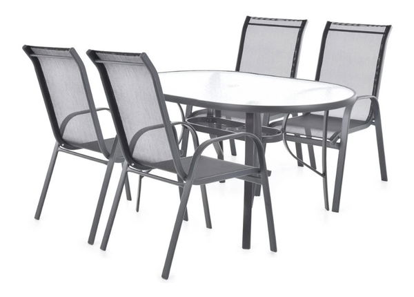 Zahradní sestava čtyř stohovatelných židlí a jednoho stolu s tvrzeným sklem. Vyrobeny jsou z ocelovo-hliníkových profilů s komaxitovou povrchovou úpravou. Tato sestava je vhodná pro zahradní kryté plochy. Nevhodné pro použití ve vlhkém prostředí.