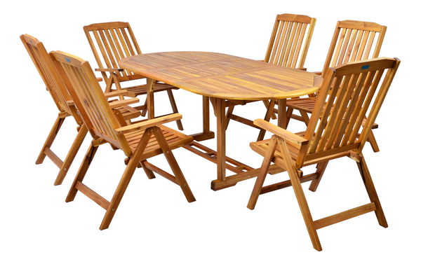 Zahradní sestava / set dřevěného sezení. Sestavu tvoří velký rozkládací stůl a šest křesel z tropického dřeva Akácie. Stůl má ve složeném stavu délku 150 cm a po rozložení až 200 cm. Křesla jsou polohovatelné. Vhodné pro kryté zahradní plochy a interiéry. Při vhodném ošetření teakovým olejem lze použít i v exteriéru.