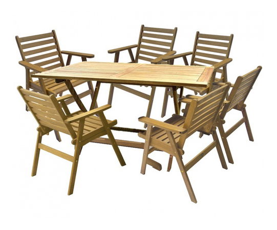 Luxusní set šesti křesel a jednoho stolu z tvrdého dřeva Akácie. Doporučené použití je v interiéru, nebo v zahradních plochách s krytím. Pro použití v exteriéru doporučujeme ošetřovat Teakovým olejem. Dřevo je z přírodního materiálu.