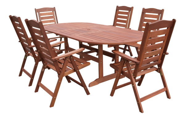 Luxusní sestava šesti polohovatelných rozkládacích křesel s rozkládacím stolem z tvrzeného dřeva Meranti. Stůl má ve složeném stavu délku 173 cm a po rozložení až 219 cm. Tento zahradní set je vhodný pro zahradní kryté plochy a interiéry. Při vhodné údržbě teakovým olejem je možné set používat iv exteriéru.