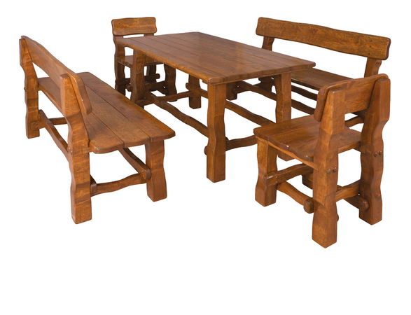 Pěkný zahradní nábytek, který svým vzhledem a tvarem připomíná nábytek z minulosti. Jemně vlnité křivky ve Vás vyvolávají pocit historie. Je vyroben z kvalitního masivu, který vyniká vysokou stabilnosti a životností. Komplet obsahuje velký stůl, dvě lavičky a dvě židle. Pohodlně se za něj usadí minimálně šest osob.