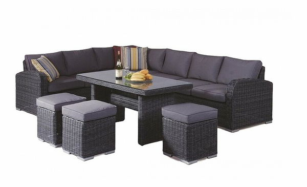 Elegantní zahradní sestava obsahuje 1x stůl, 1x rohovou sedačku a 3x taburet. Materiál je odolný vůči UV záření a teplotě od + 50°C do - 10°C. Celá sestava je vhodná jak do interiéru, tak i do exteriéru.