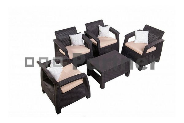 Moderní sestava Orion pěkného hnědého provedení z umělého ratanu. Vašim verandám, balkonem a terasám dodá moderní a elegantní vzhled. Sestava se skládá ze stolu a čtyř křesel.