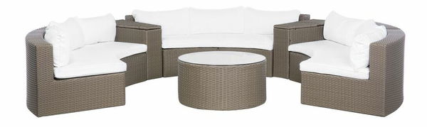 Tato půlkruhová sedací souprava ve tvaru písmene U vytvoří dokonalé místo k sezení v zahradě nebo na terase. Je vyrobena z umělého ratanu a sestává z devíti kusů, které poskytují maximální pohodlí, funkčnost a stylový design. Součástí soupravy jsou také měkké bílé polštáře a podsedáky se snímatelnými potahy pro snadnější čištění. Dva univerzální úložné boxy, které oddělují pohovku, jsou prostorné a poskytují dostatek úložného prostoru pro všechny letní doplňky. Boxy lze využít také jako praktický příruční stolek.