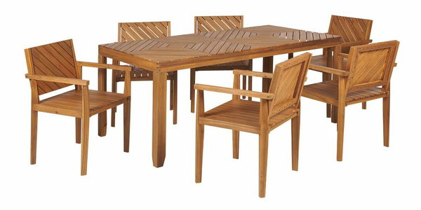 Dokonalé spojení tradice a moderního stylu. Tato zahradní jídelní sada s nadčasovým designem je vyrobena z odolného akáciového dřeva. Sestává z prostorného stolu a šesti pohodlných židlí. Ať už plánujete neformální rodinné setkání nebo slavnostní zahradní soirée, tato souprava bude výbornou volbou, neboť doplní jakékoliv venkovní prostředí a vnese do něj eleganci a půvab, čímž zpříjemní stolování na čerstvém vzduchu.