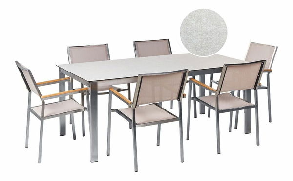 Udělejte ze své zahrady či terasy stylové místo ke stolování s nejbližšími. Stůl je vyroben z nerezavějící oceli, kterou doplňuje stolová deska z tvrzeného skla v nadčasové bílé barvě. Díky přirozené odolnosti vůči UV záření, vodě a rzi je ideální volbou do moderních venkovních prostor. Velká stolová deska poskytuje dostatek místa pro 6 osob, takže pořádání větších oslav bude snadné. Součástí jídelní sestavy je 6 židlí s textilními opěradly a sedadly, které zvýrazňují moderní vzhled nábytku a poskytují pohodlné místo k sezení.